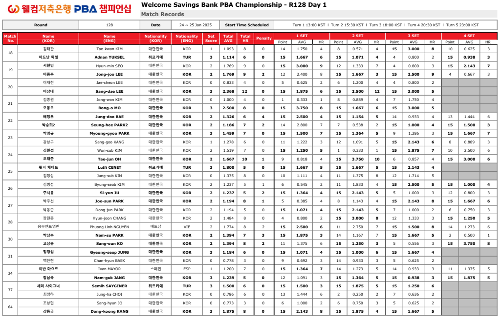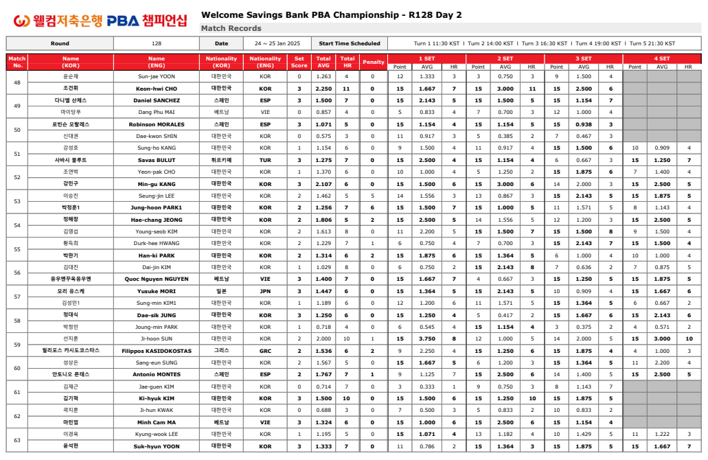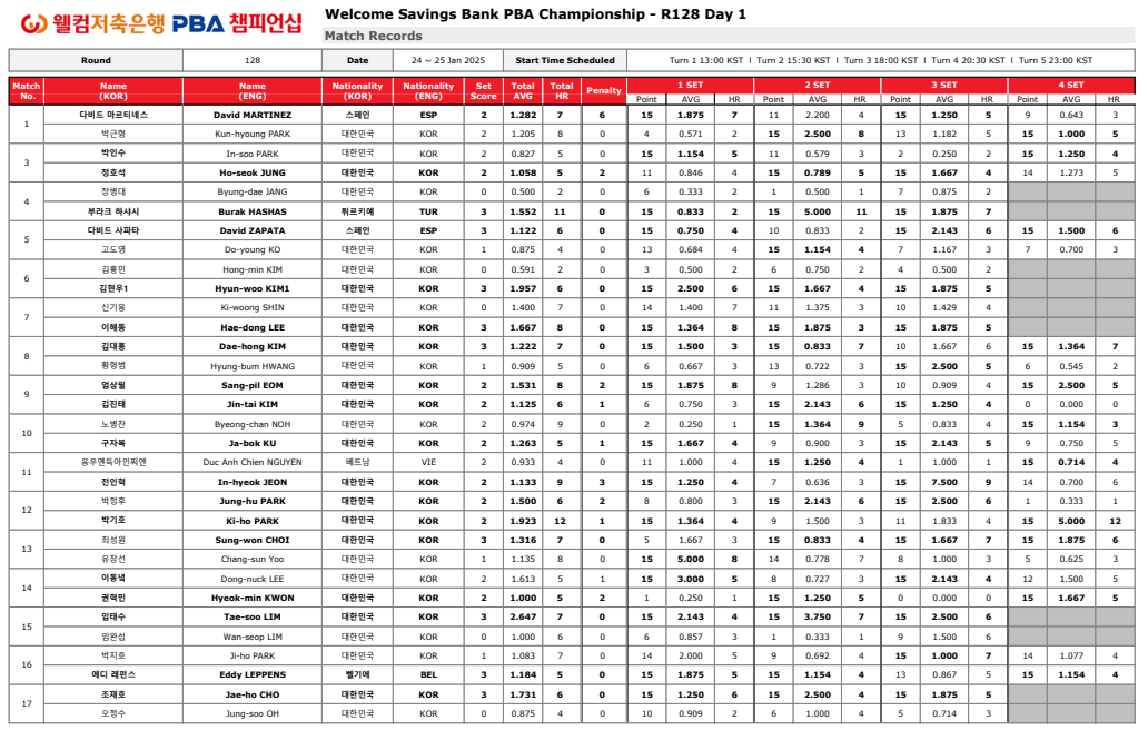 1. 웰컴저축은행 PBA 챔피언십128강 경기결과