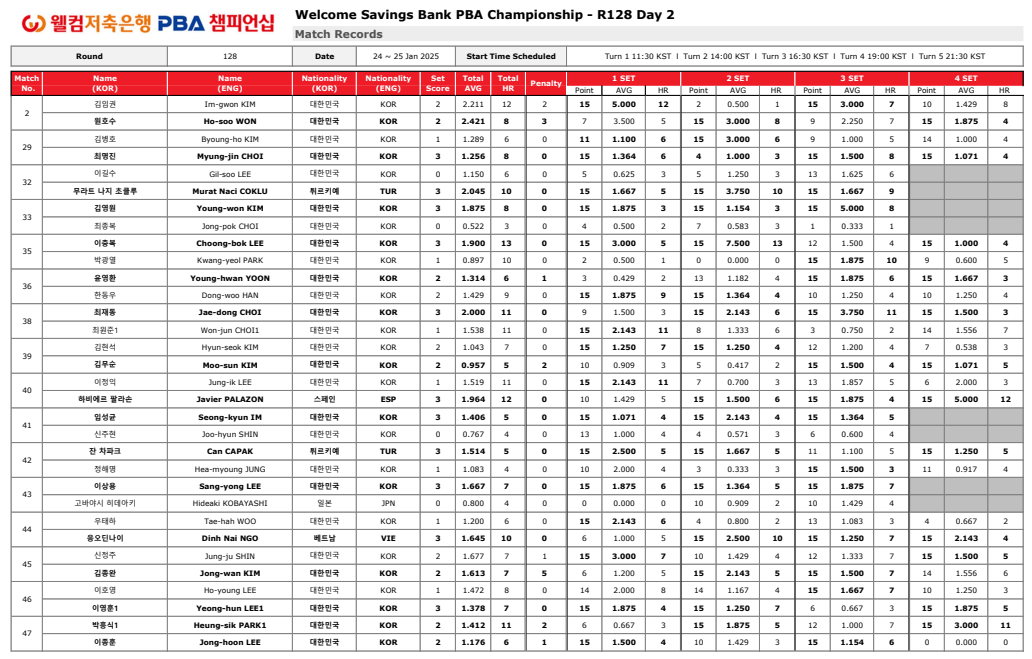 다음은 웰컴저축은행 PBA 쳄피언십 128강 2일차 경기결과입니다.