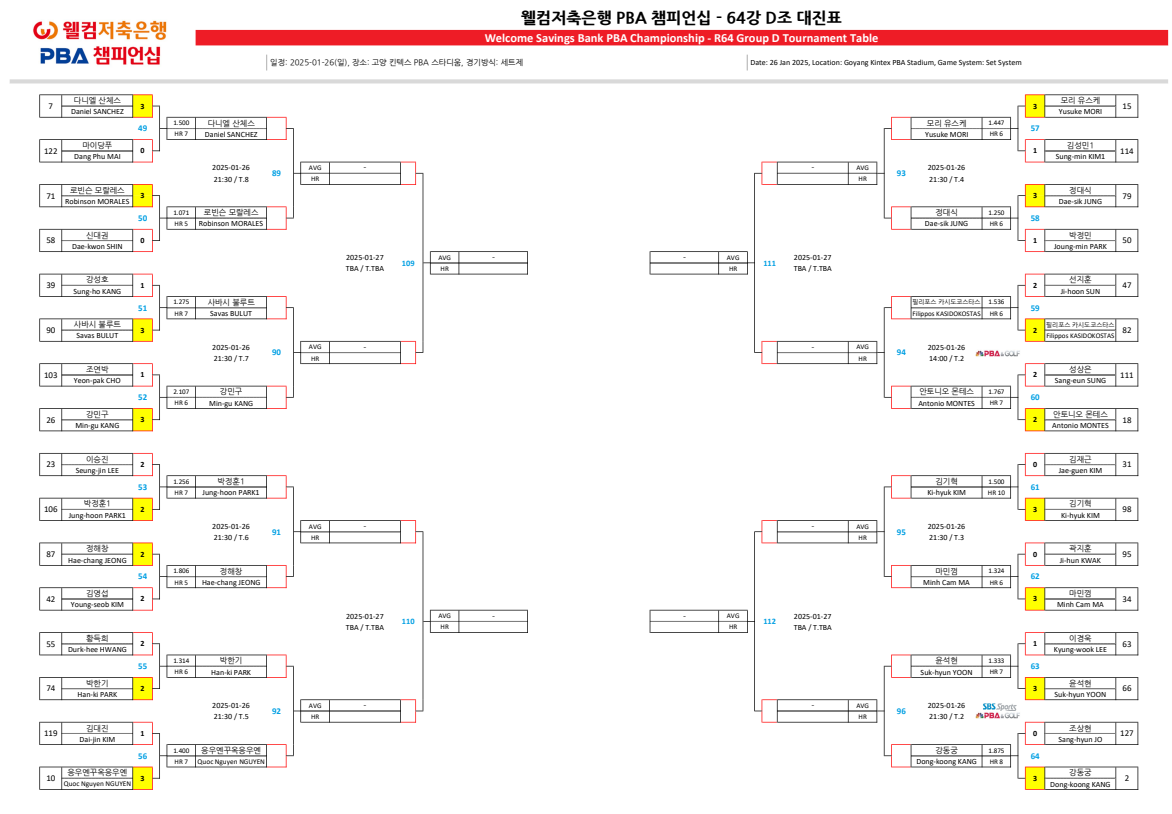 웰컴저축은행 PBA 챔피언십 64강 D조 대진표입니다.