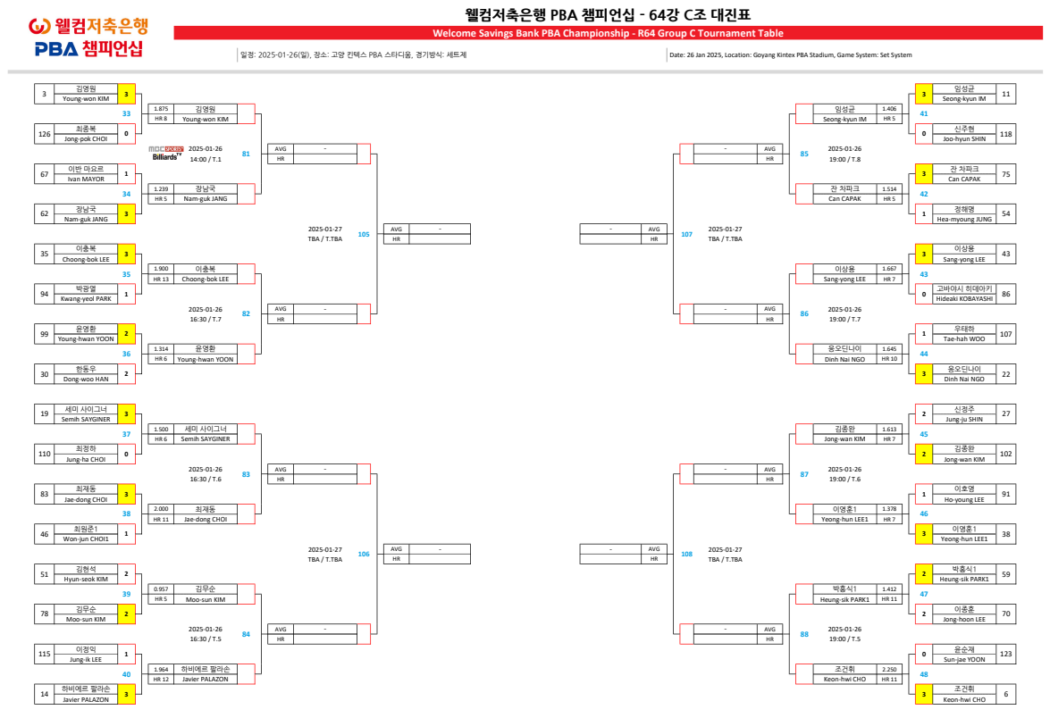 웰컴저축은행 PBA 챔피언십 64강 C조 대진표입니다.