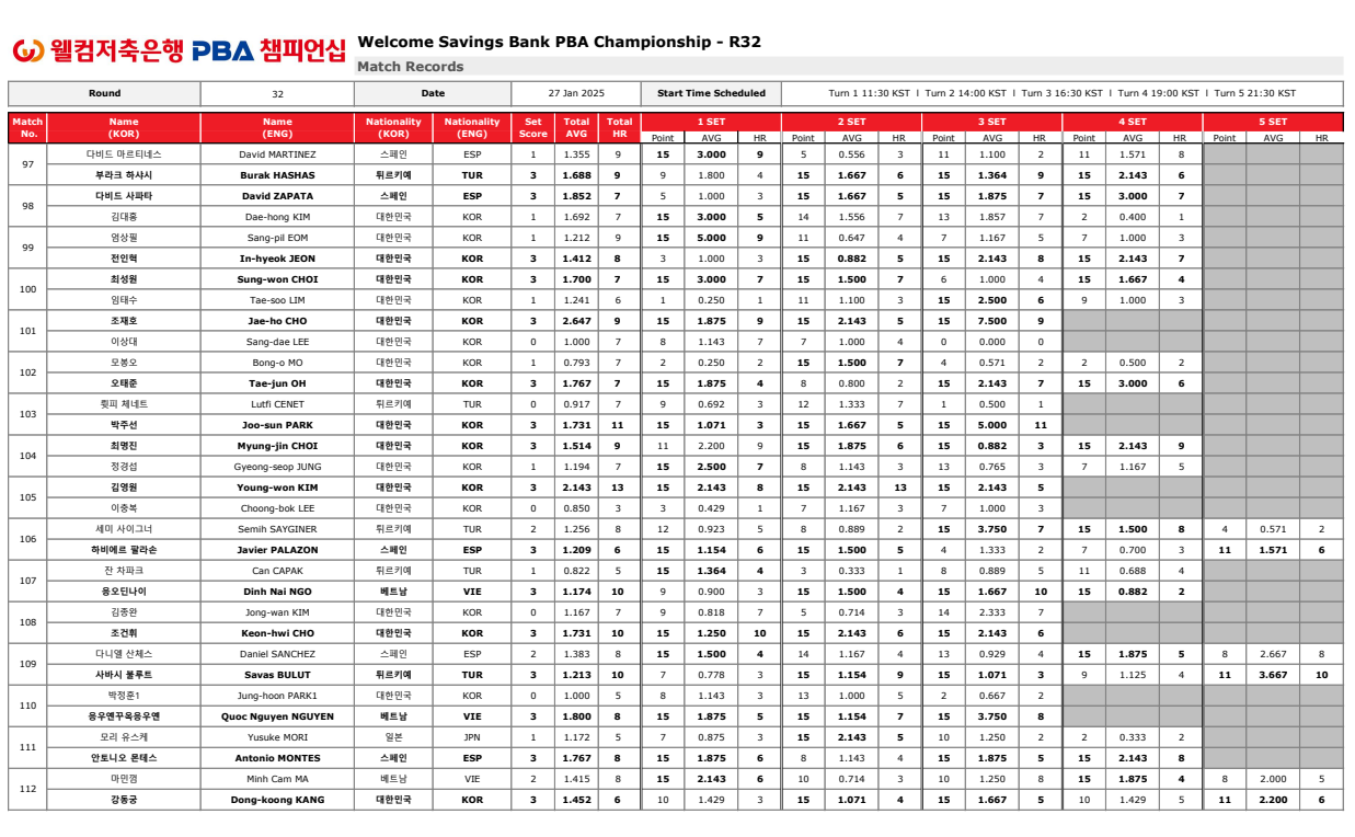 1. 웰컴저축은행 PBA 챔피언십 32강 경기결과