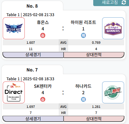 현재 하위권에 머물러있는 휴온스가 우리금융캐피탈을 3:2로 꺾고 5라운드 첫 승을 신고했습니다. 이신영-이상대 선수의 활약이 두드러졌으며, 최종적으로 역전승을 거뒀습니다. 하나카드도 하이원리조트 프로 당구팀을 잡으면서 좋은 스타트를 끊었습니다.