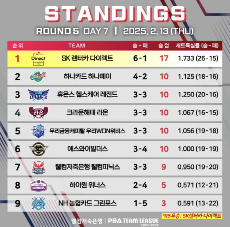 한편 크라운해태 라온 당구팀은 5라운드 우승 실패하였으며, 프로당구 2024-25시즌 PBA팀리그 포스트시즌 진출팀도 확정되었습니다. 크라운해태 라온 당구팀이 우리금융캐피탈에 3:4로 패배하면서 SK렌터카 프로당구팀의 우승이 확정되었습니다.포스트시즌 진출팀은 정규리그에서 각 라운드 우승팀인 SK렌터카 프로당구팀, 웰컴저축은행, NH농협카드, 하나카드와 종합 차순위로 우리금융캐피탈이 확정되었습니다.