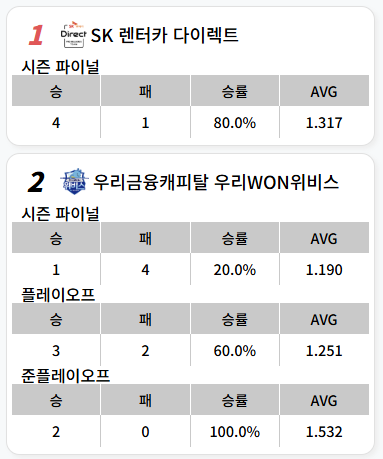SK렌터카 다이렉트 당구팀의 경기력을 살펴보면, 올 시즌 파이널 경기에서 4승 1패, 승률 80%, 에버리지 1.317을 기록하면서 우승을 차지했습니다. 반면 우리금융캐피탈 우리원 위비스 당구팀은 준레이오프부터 올라가 플레이오프를 거쳐 파이널까지 진출한 팀입니다. 시즌 파이널에서 1승 4패로 패하였지만은 강한 저력을 보여주었습니다.