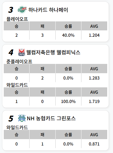 한편 포스트 시즌에 올라온 다른 세 팀의 경기를 살펴보면, 우선 NH농협카드 그린 포스는 와일드카드로 진출하였으나 웰컴 저축은행 웰컴 피닉스와의 경기에서 패하면서 플레이오프 진출이 좌절되었습니다. 웰컴저축은행 당구팀은 와일드카드로 올라온 NH 농협카드 그린 포스팀을 이기고 플레이오프에 진출하였으나 우리금융캐피탈에게 패하였습니다.