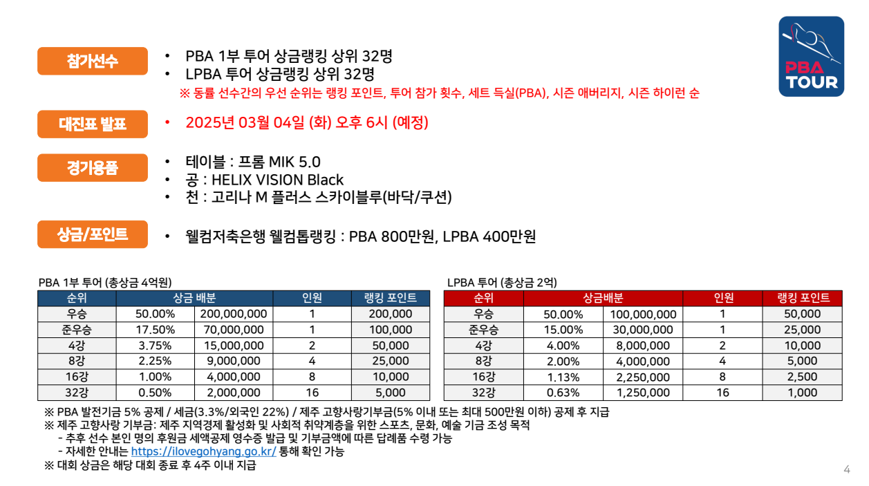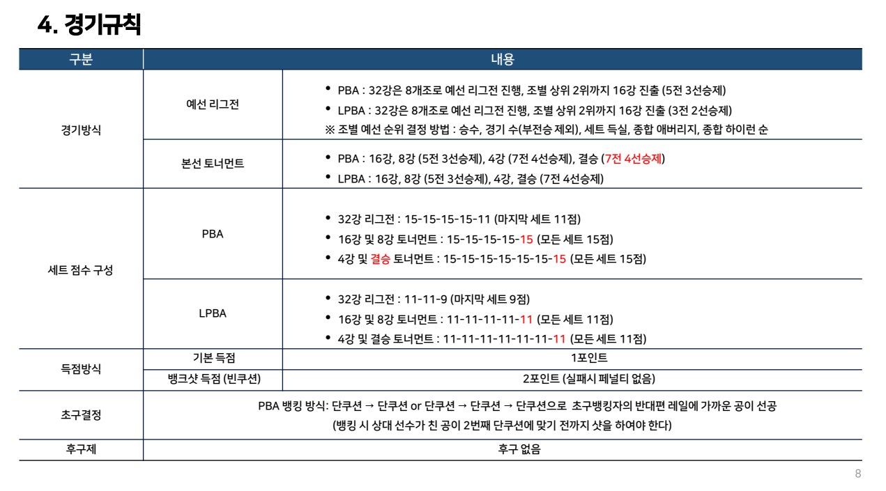 - 본선 토너먼트: PBA는 16강, 8강은 (5전 3선승제), 4강은 (7전 4선승제), 결승은 (7전 4선승제)롤 펼쳐집니다. LPBA는 16강, 8강은 (5전 3선승제), 4강, 결승은 (7전 4선승제) 로 펼쳐집니다.