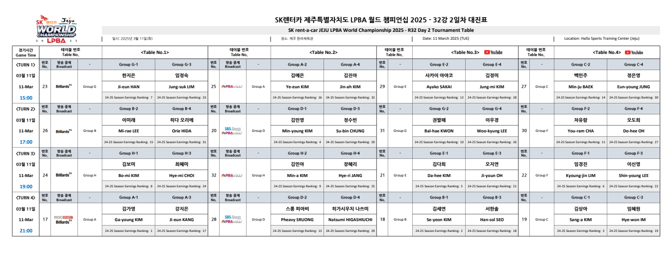 SK렌터카 제주특별자치도 PBA 월드 챔피언십 2025 - 32강 대진표(1일차, 2일차 예선리그) (0) | 2025.03.08 |