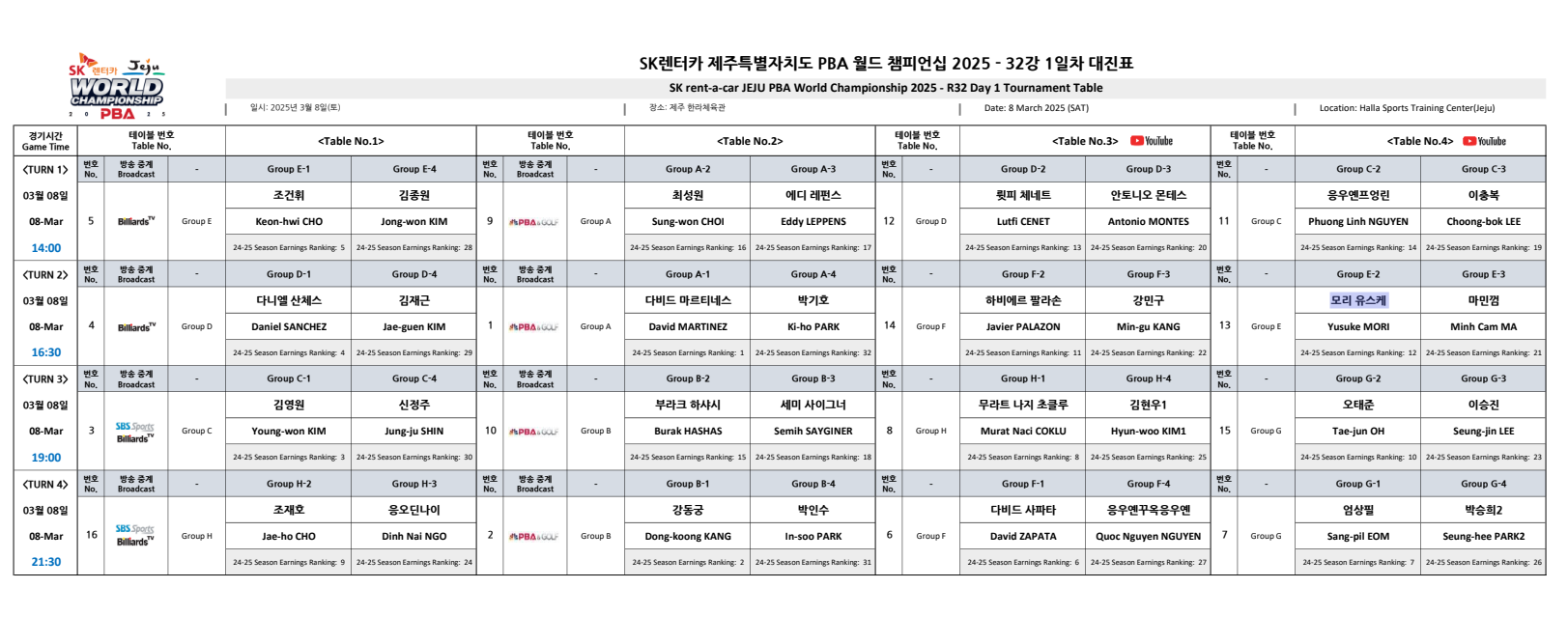 안녕하세요, 당구 팬 여러분! 🎱 SK렌터카 제주특별자치도 PBA 월드 챔피언십 2025의 뜨거운 막이 올랐습니다. 이번 포스팅에서는 3월 8일과 10일에 펼쳐지는 32강 경기의 대진표와 일정을 자세히 소개해 드립니다. 🗓️