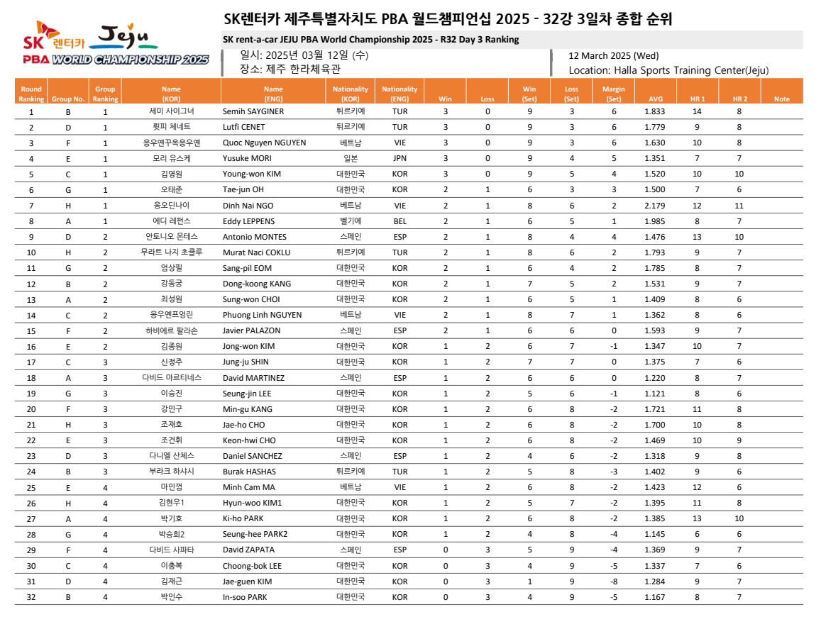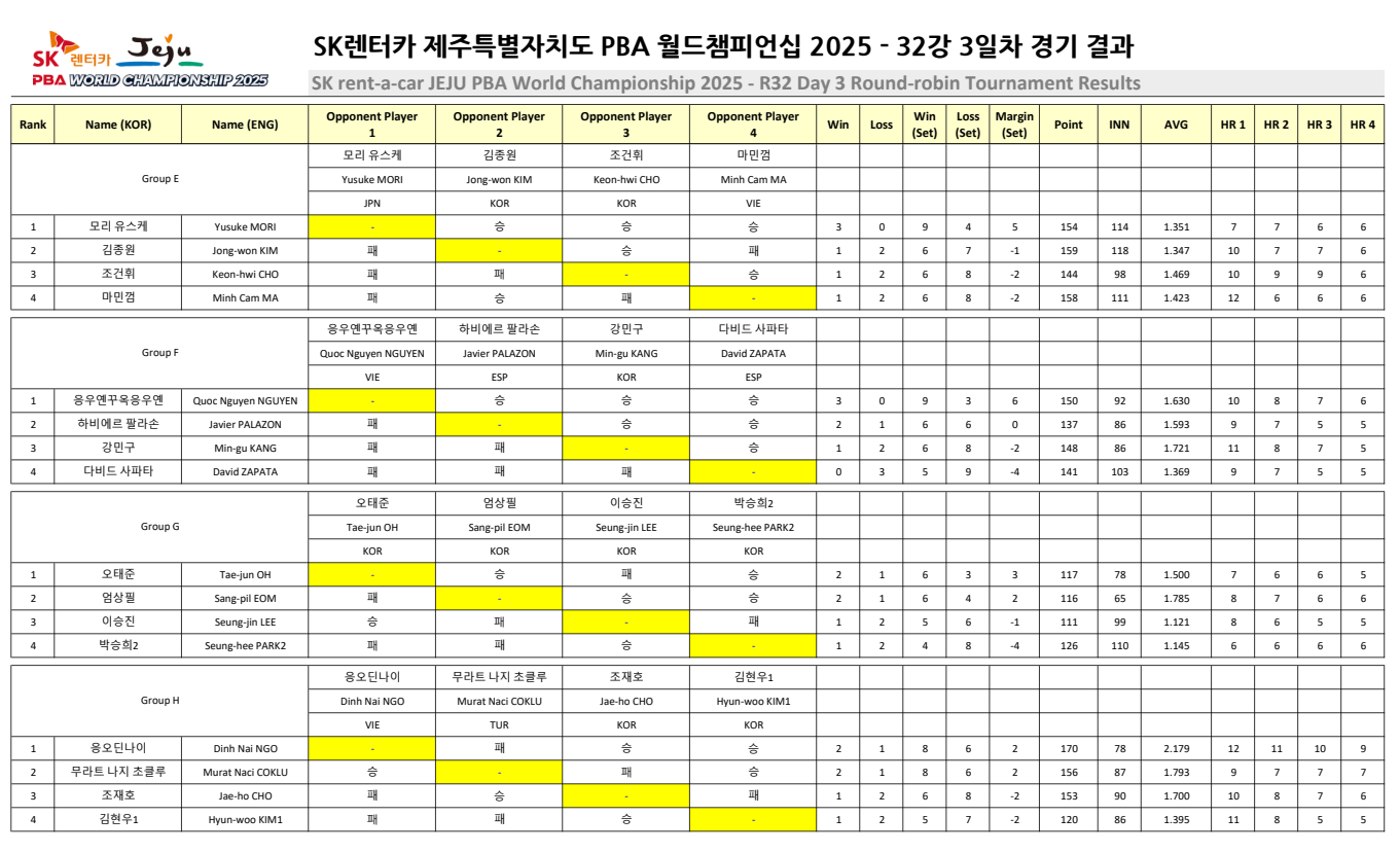 🏆 SK렌터카 제주특별자치도 PBA 월드챔피언십 2025 - 32강 3일차 경기 결과 및 종합 순위
