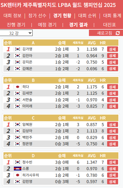조금전에 "SK렌터카 제주특별자치도 LPBA 월드챔피언십 2025" 대회 32강 예선리그 3일차 경기가 끝이 났습니다. 그 경기결과에 따라 3월 15일부터 시작되는 SK렌터카 LPBA 월드챔피언십 2025 16강 대진표가 확정이되었습니다.