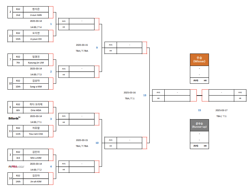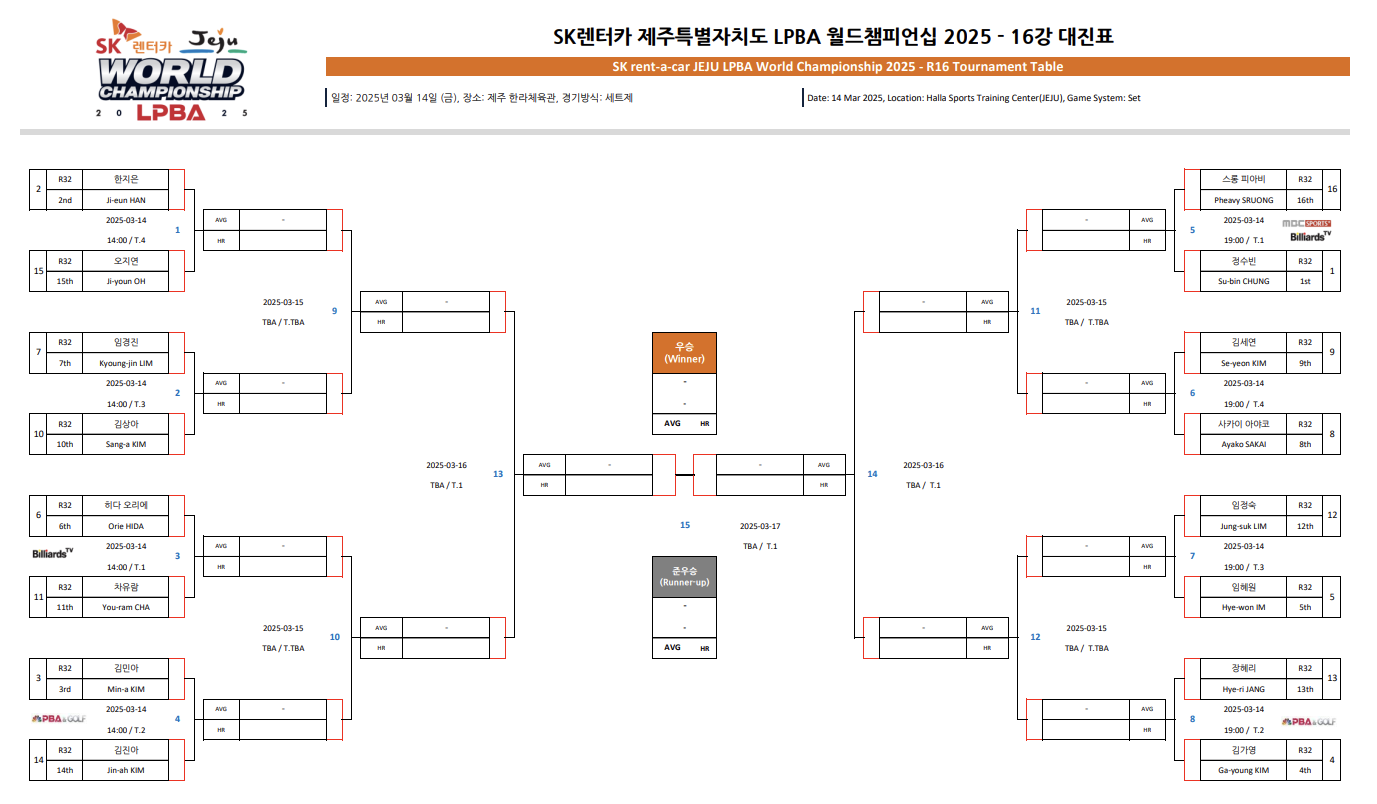 | SK렌터카 LPBA 월드챔피언십 2025 - 8강 대진표, 16강 경기결과 (0) | 2025.03.14 |