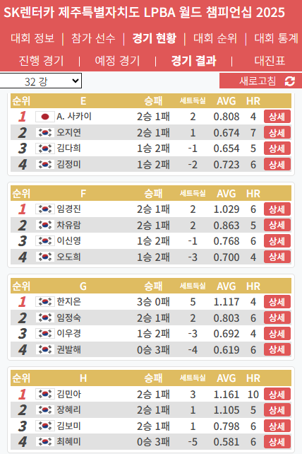 조금전에 "SK렌터카 제주특별자치도 LPBA 월드챔피언십 2025" 대회 32강 예선리그 3일차 경기가 끝이 났습니다. 그 경기결과에 따라 3월 15일부터 시작되는 SK렌터카 LPBA 월드챔피언십 2025 16강 대진표가 확정이되었습니다.