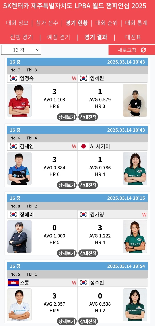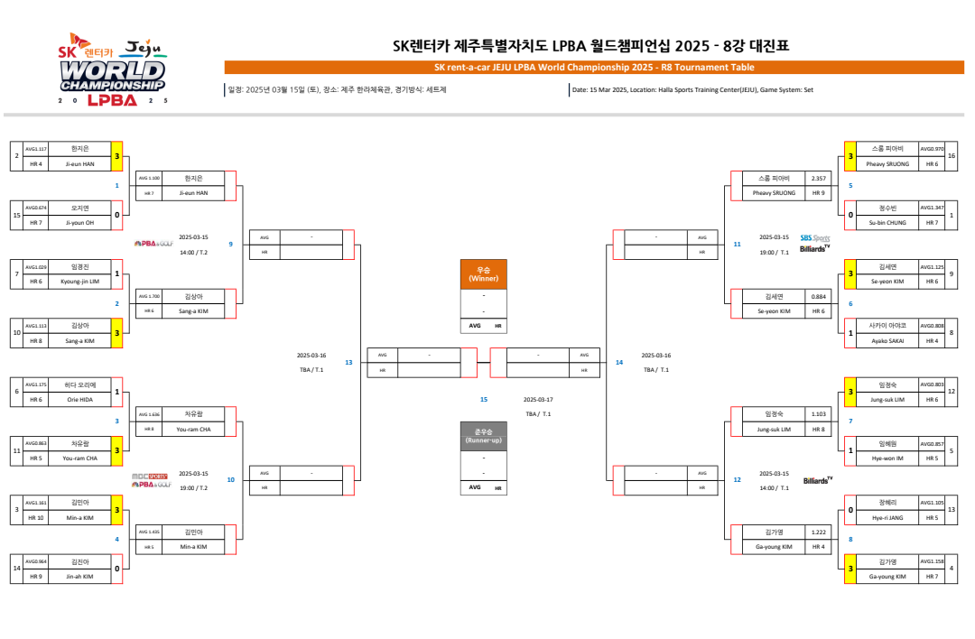 조금전에 "SK렌터카 제주특별자치도 LPBA 월드챔피언십 2025" 대회 16강 경기가 끝이 났습니다. 그 경기결과에 따라 3월 15일부터 시작되는 SK렌터카 LPBA 월드챔피언십 2025 8강 대진표가 확정이되었습니다.