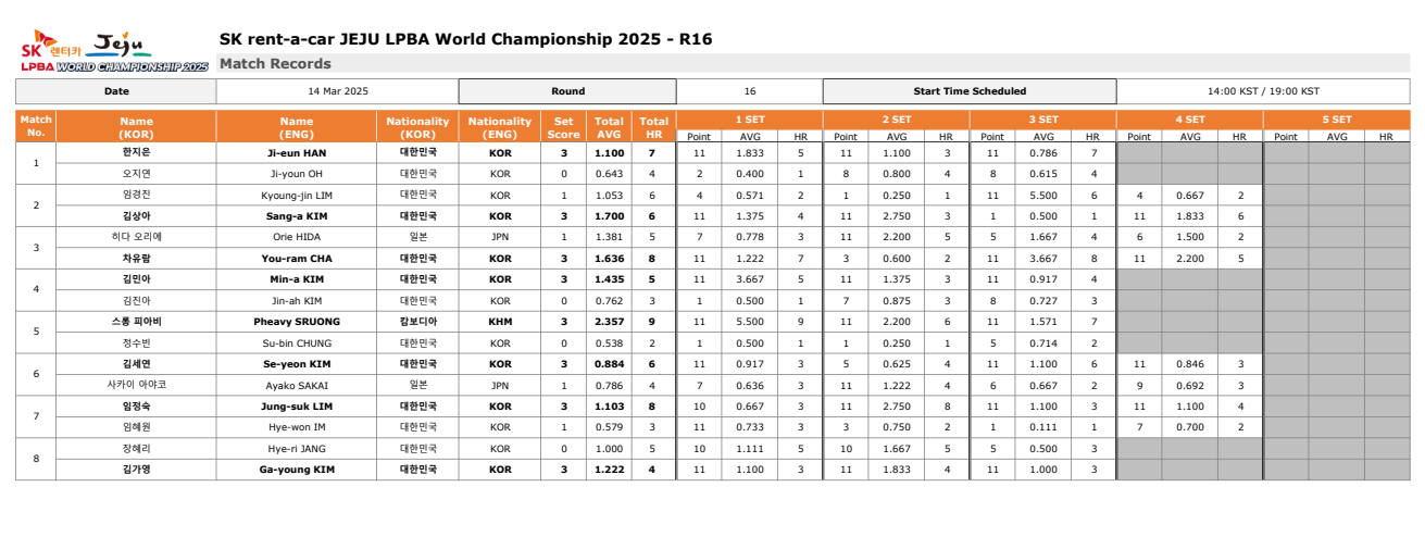 1. LPBA 월드챔피언십 16강 경기결과(3월 14일)