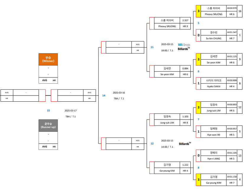 | SK렌터카 LPBA 월드챔피언십 2025 16강 대진표 - 스롱 정수빈 맞대결 (0) | 2025.03.13 |
