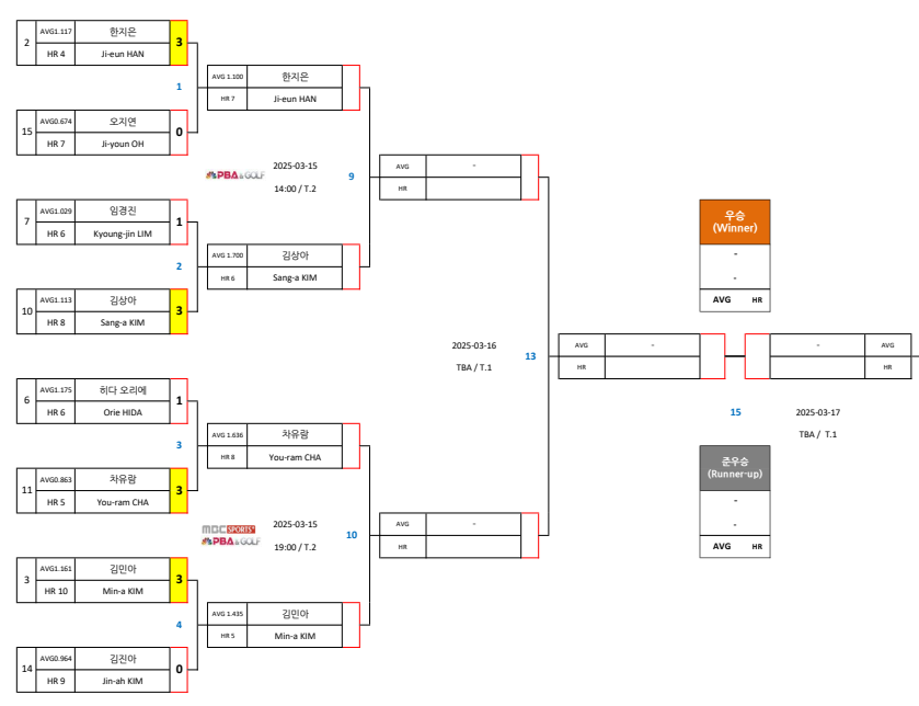 | SK렌터카 LPBA 월드챔피언십 2025 - 4강 대진표, 8강 경기결과 (0) | 2025.03.15 |