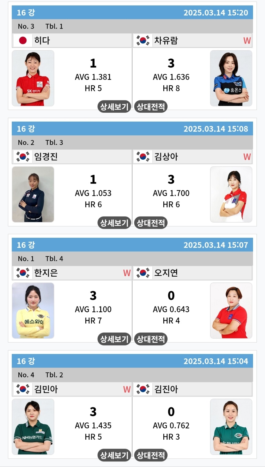조금전에 "SK렌터카 제주특별자치도 LPBA 월드챔피언십 2025" 대회 16강 경기가 끝이 났습니다. 그 경기결과에 따라 3월 15일부터 시작되는 SK렌터카 LPBA 월드챔피언십 2025 8강 대진표가 확정이되었습니다.