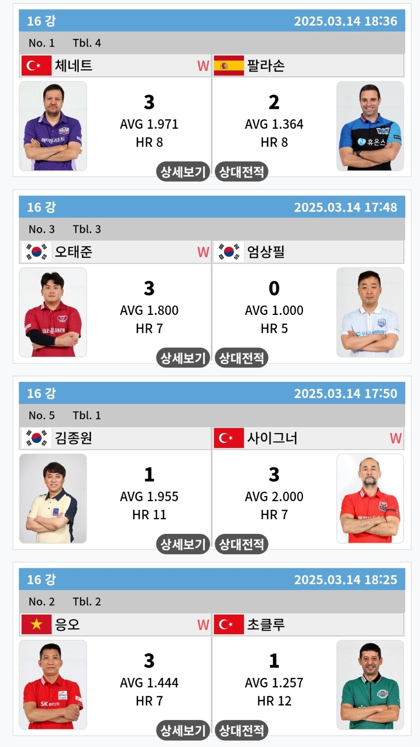 | SK렌터카 PBA 월드챔피언십 2025 - 4강 대진표 8강 경기결과 (0) | 2025.03.16 |