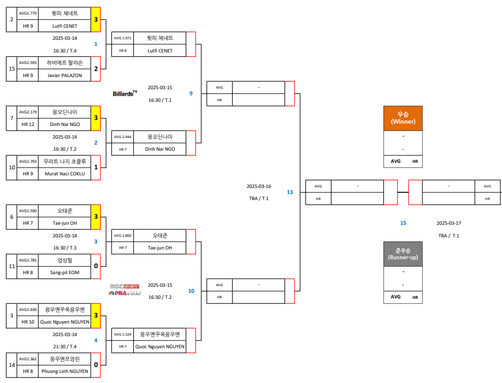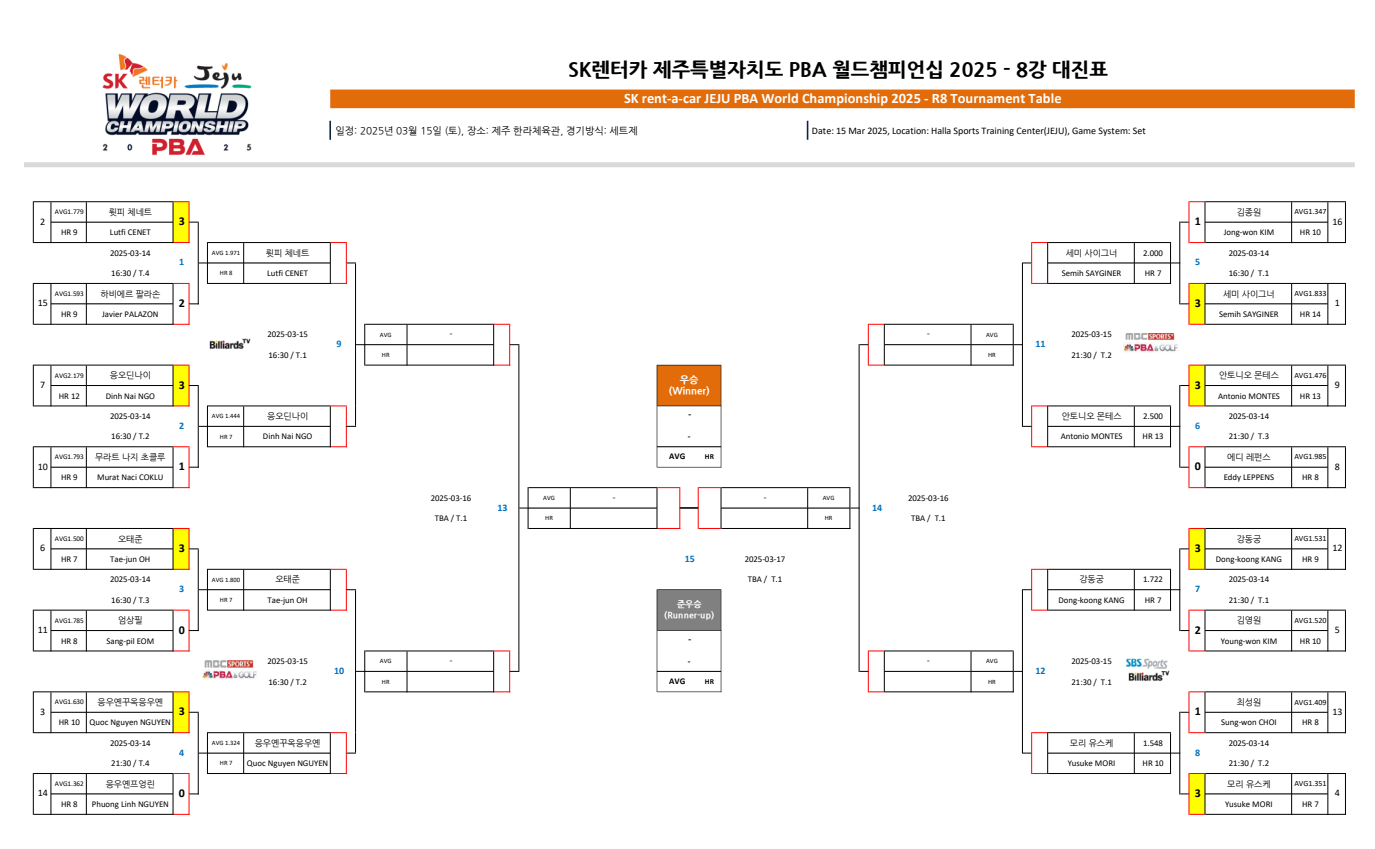 3월 15일 경기가 펼쳐지는 "SK렌터카 제주특별자치도 PBA 월드챔피언십 2025" 대 8강 대진표입니다.