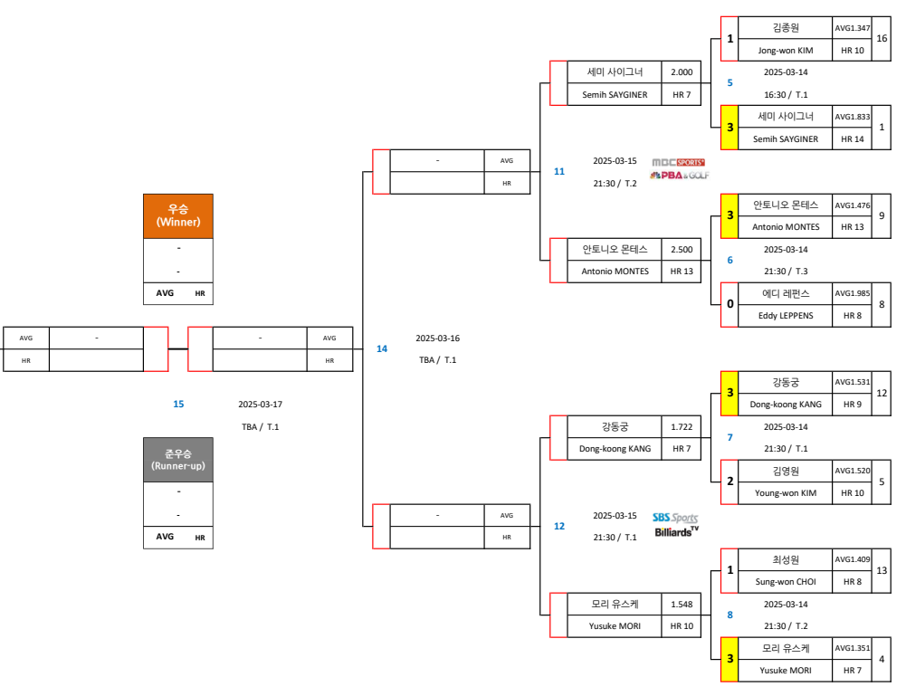 | SK렌터카 PBA 월드챔피언십 2025 - 4강 대진표 8강 경기결과 (0) | 2025.03.16 |