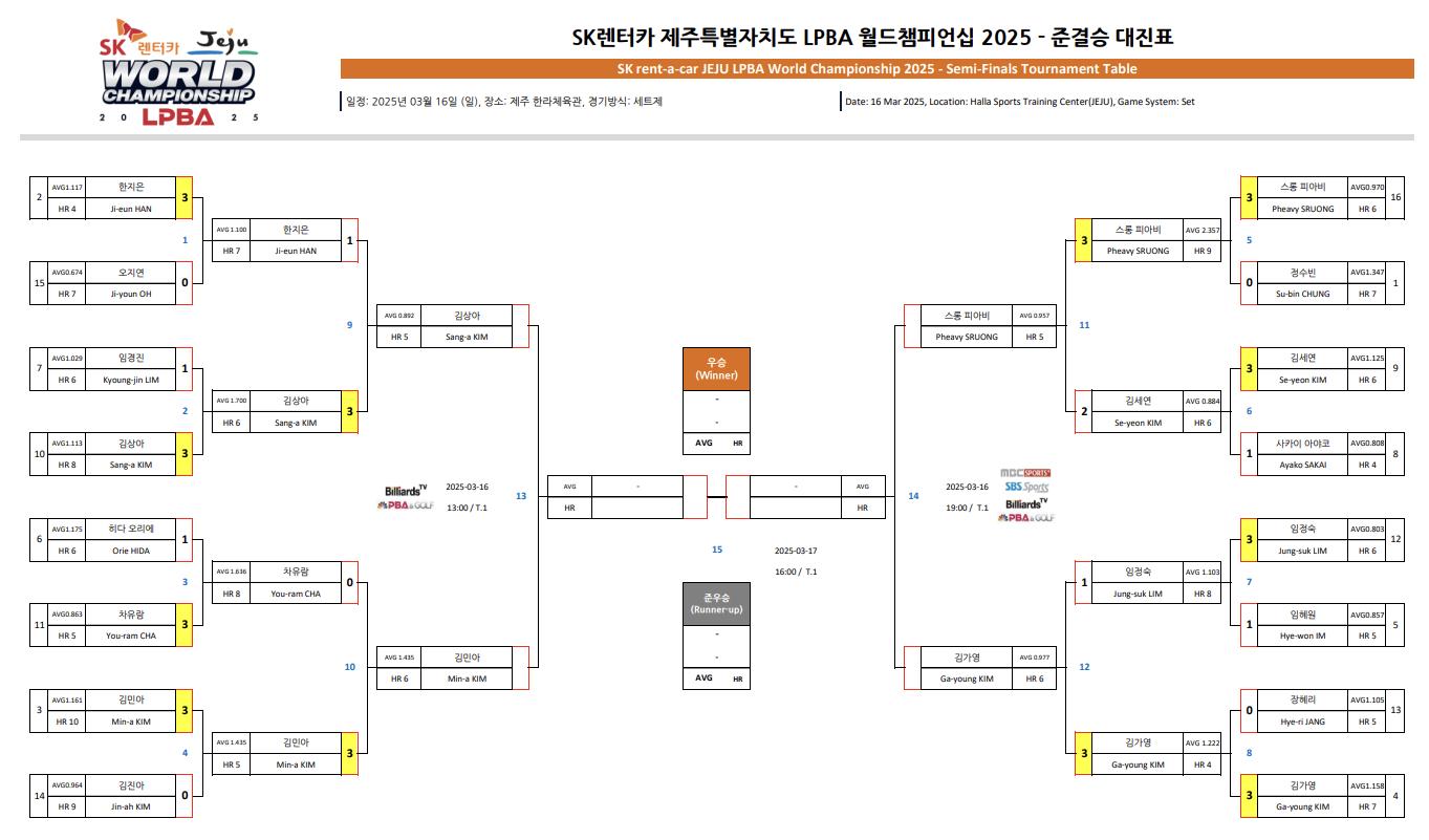 | SK렌터카 LPBA 월드챔피언십 2025 결승 대진표 - 김가영 vs 김민아 (0) | 2025.03.16 |