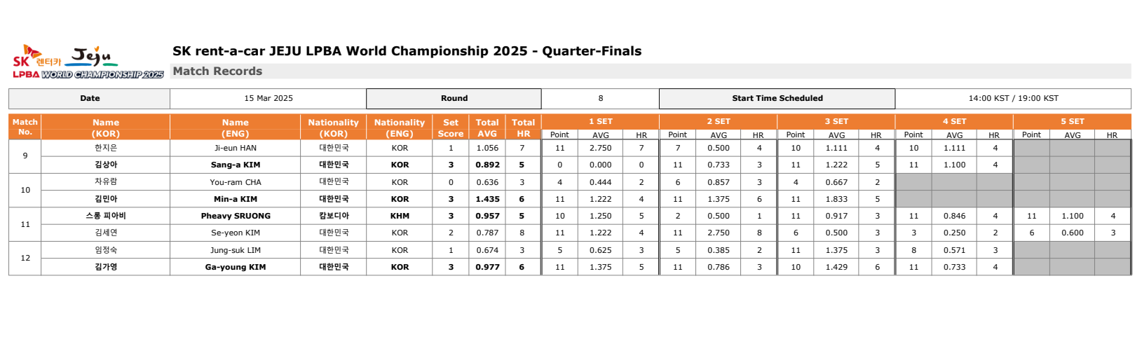 SK렌터카 제주특별자치도 LPBA 월드챔피언십 2025 - 8강 경기는 한지은 - 김상아, 차유람 - 김민아, 스롱 피아비 - 김세연, 임정숙 - 김가영 선수의 경기로 펼쳤습니다.