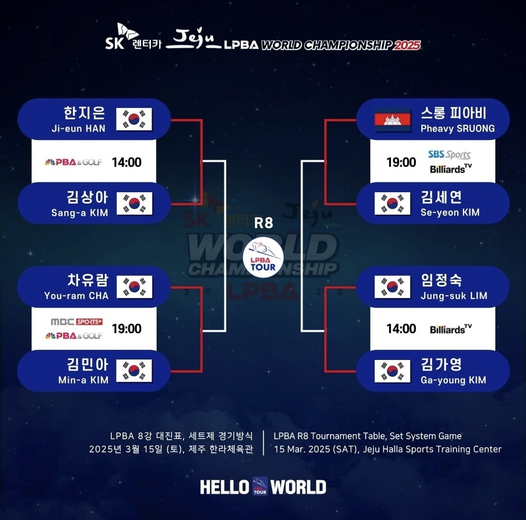 조금전에 "SK렌터카 제주특별자치도 LPBA 월드챔피언십 2025" 대회 8강 경기가 막 끝이 났습니다. 그 경기결과에 따라 3월 16일부터 시작되는 SK렌터카 LPBA 월드챔피언십 2025 4강 준결승 대진표가 확정이되었습니다.