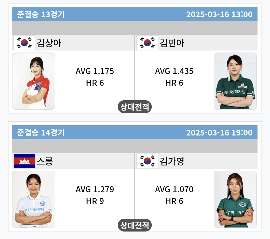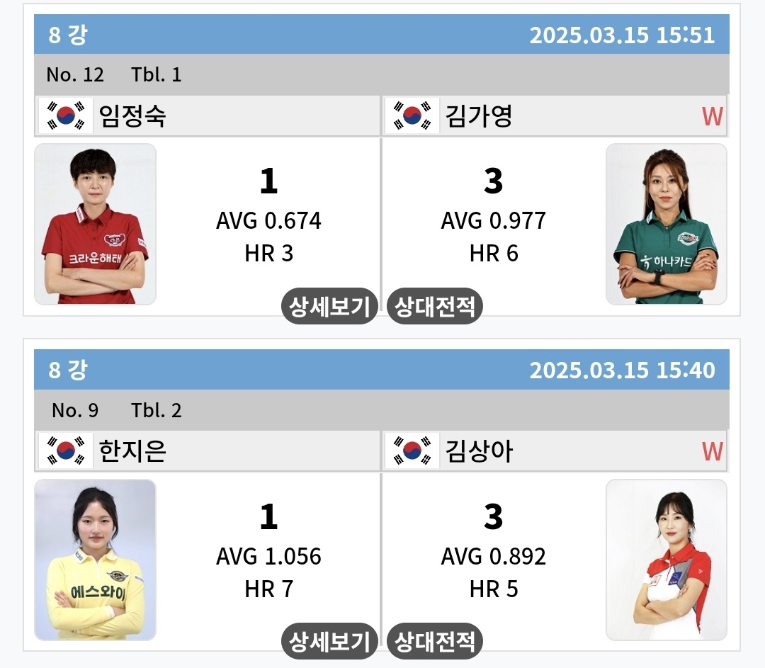 | SK렌터카 LPBA 월드챔피언십 2025 결승 대진표 - 김가영 vs 김민아 (0) | 2025.03.16 |
