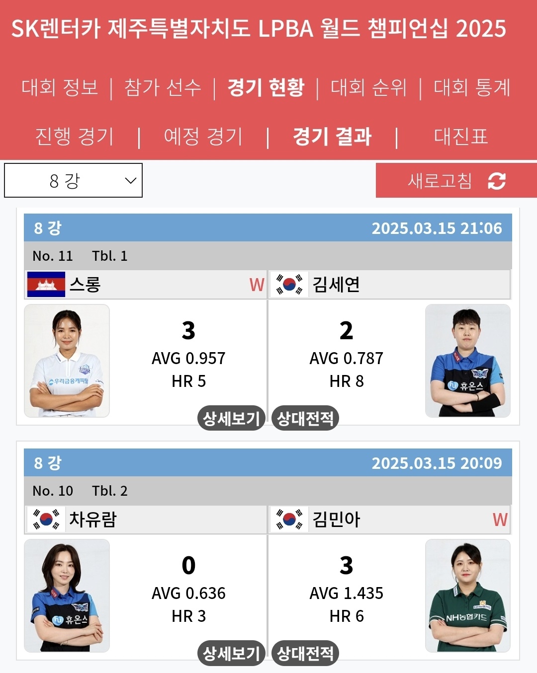 1. LPBA 월드챔피언십 8강 경기결과(3월 15일)