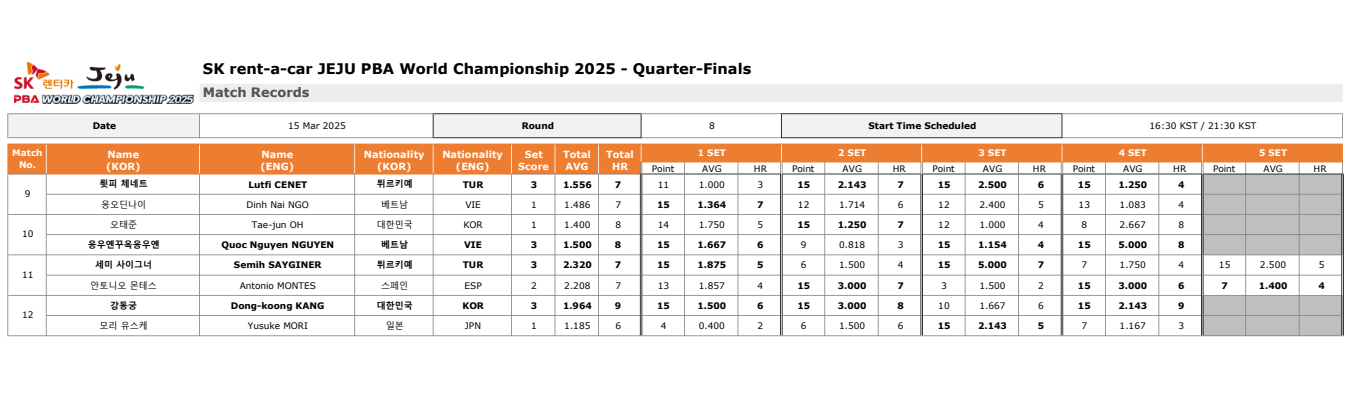 제주특별자치도 한라체육관에서 열린 SK렌터카 제주특별자치도 PBA 월드챔피언십 2025의 또 다른 8강 경기 결과입니다. 륏피 체네트 - 응오딘나이 경기에서는 튀르키예의 륏피 체넷(체네트)가 베트남의 응오딘나이를 꺽고 8강 대진표에 이름을 올렸습니다. 이로써 이번 4강 진출자 명단에는 튀르키예 출신이 2명이나 올랐습니다. 반면  PBA 강호들이 즐비한 스페인 출신은 아무도 올라가지 못했습니다.