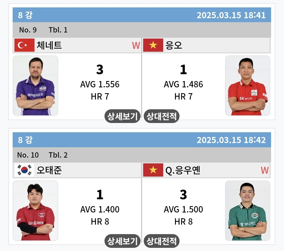 튀르키예 선수가 2명(세미 사이그너, 륏피 체네트)이나 준결승에 진출한 것이 인상적입니다. 베트남의 응우옌 꾸옥 응우옌과 한국의 강동궁은 적어도 튀르키예 선수들까지 펼치는 결승전을 막아 내기를 기대합니다.