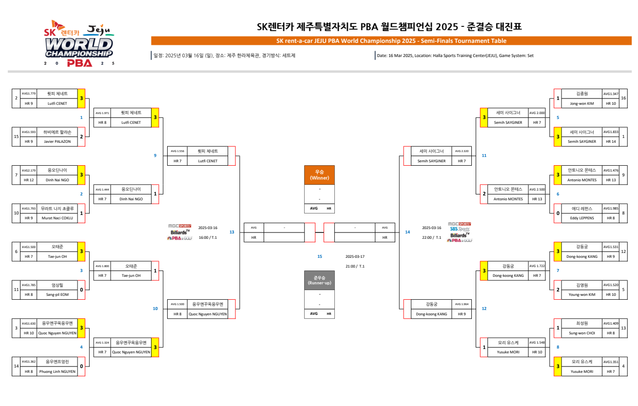 3월 16일 경기가 펼쳐지는 "SK렌터카 제주특별자치도 PBA 월드챔피언십 2025" 대 4강 준결승 대진표입니다.