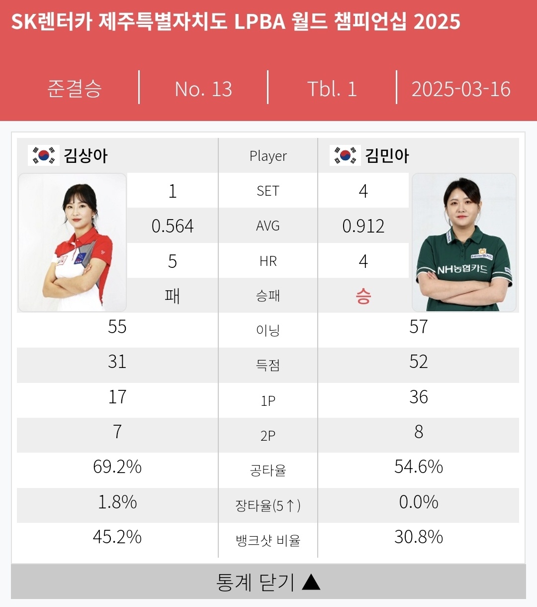 SK렌터카 제주특별자치도 LPBA 월드챔피언십 2025 - 4강 경기는 김상아 - 김민아, 스롱 피아비 - 김가영 선수로 경기로 펼쳤습니다. 4강 준결승 경기는 이전까지 보다 세트 수가 늘어난 7전 4선승제 경기로 펼쳐졌습니다.