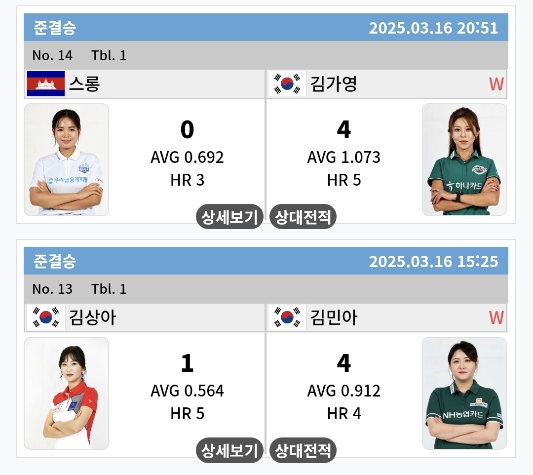| SK렌터카 PBA 월드챔피언십 2025 - 4강 대진표 8강 경기결과 (0) | 2025.03.16 |