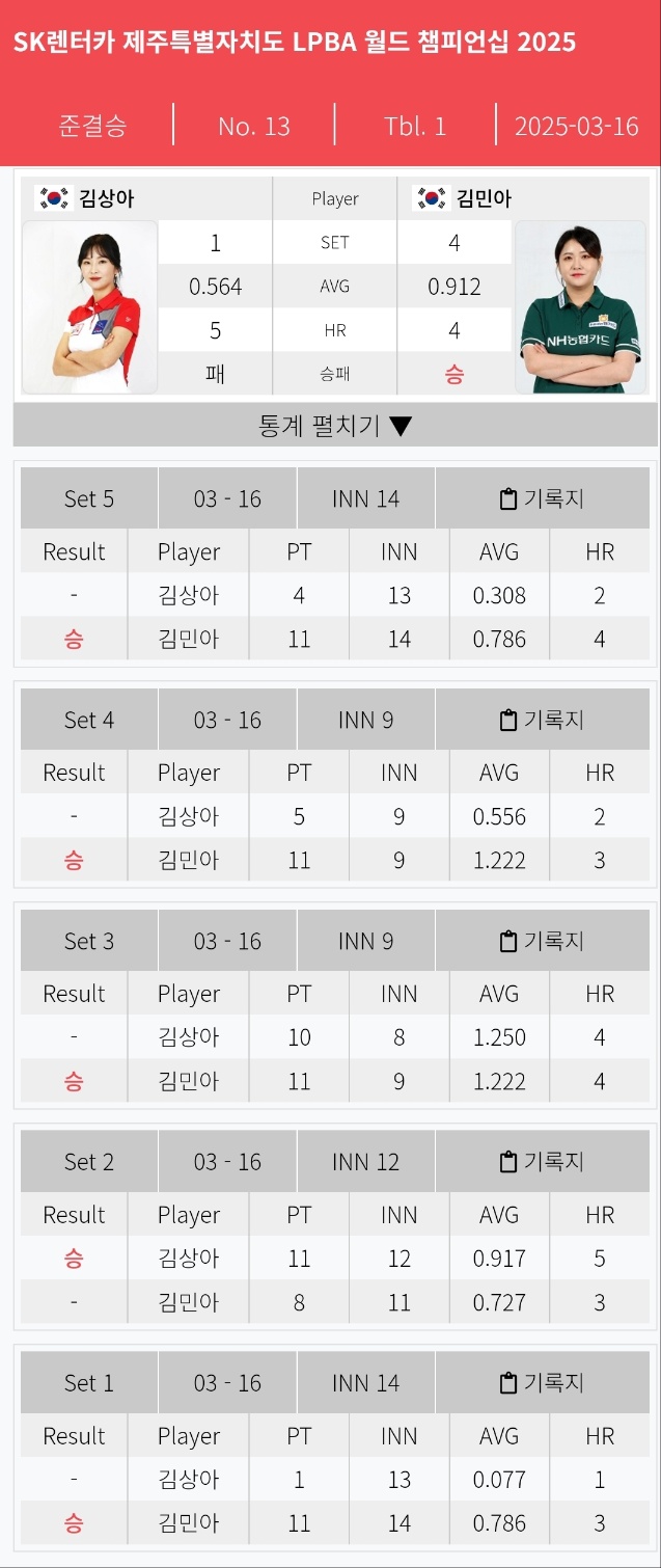 김상아 - 김민아 선수의 4강 경기결과는 김민아 선수가 2세트를 11:8로 내어 주었을뿐 나머지 1, 3, 4, 5세트를 연이어서 11:1, 11:10, 11:5, 11:4로 잡으면서 세트스코어 4대 1로 이기로 결승 진출 티켓을 잡았습니다. 두선수의 애버리지를 보면, 김민아 0.912, 김상아 0.564로 큰 차이를 보였습니다.
