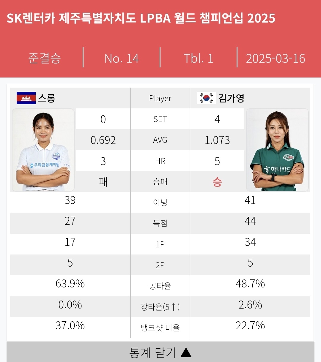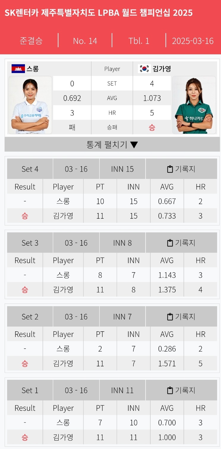 김가영 - 스롱 피아비 선수의 4강 경기결과는 김가영 선수가 4대 0로 승리하였습니다. 김가영 선수는 1세트를 11:7로 이긴데 이어 나머지 세트도 11:2, 11:8. 11:10으로 승리하면서 과거의 숙적, 스롱을 압도적으로 꺽고 결승에 진출했습니다. 두선수의 애버리지를 보면, 김가영1.073, 스롱 0.692로 큰 격차를 보였습니다.