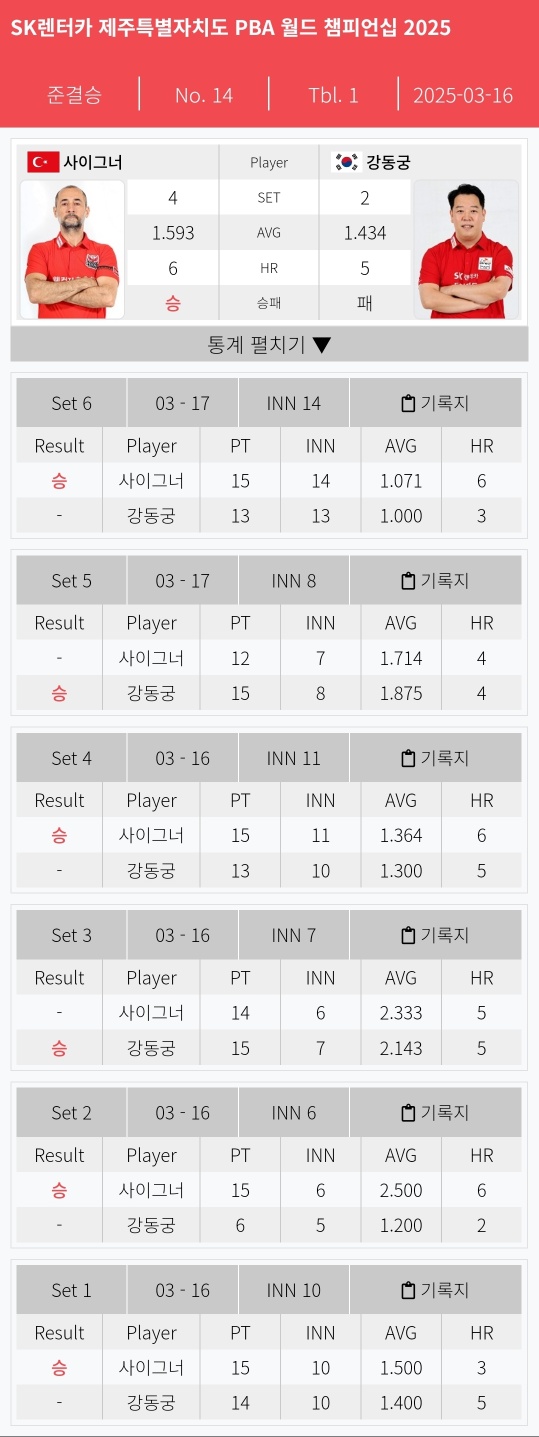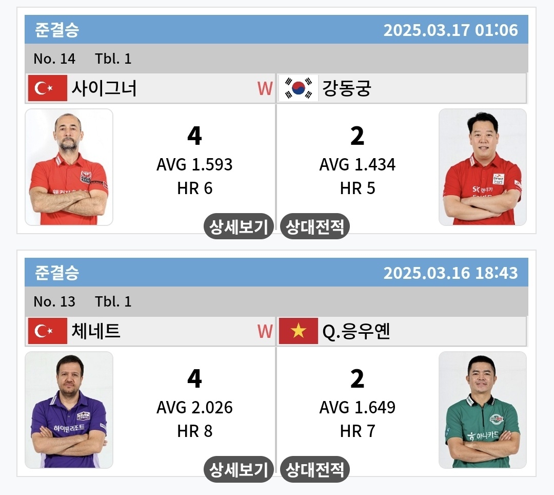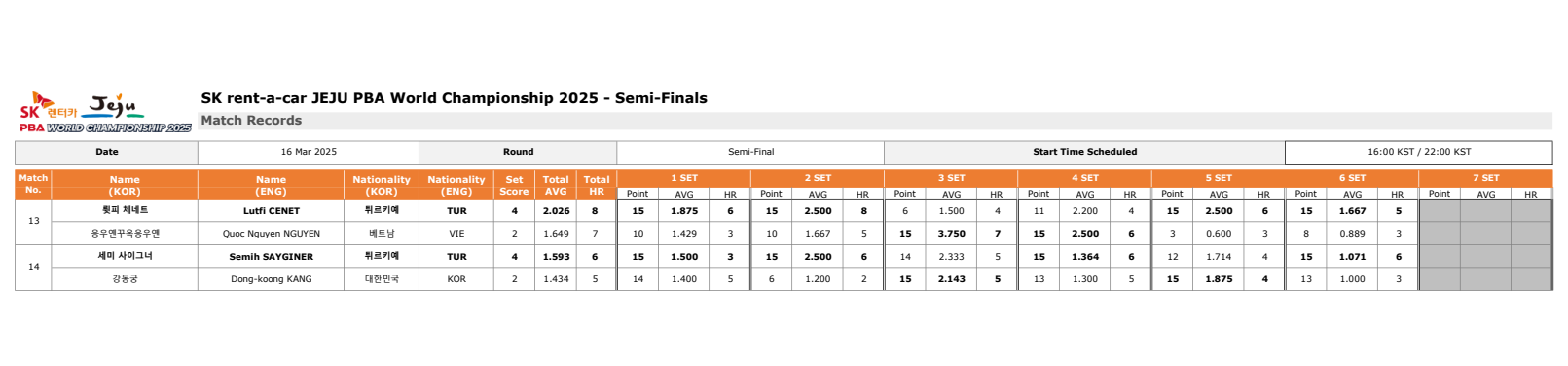 조금전에 "SK렌터카 제주특별자치도 PBA 월드챔피언십 2025" 대회 4강 경기가 나왔습니다. 그 경기결과에 따라 3월 17일 저녁 9시에 펼쳐지는 SK렌터카 PBA 월드챔피언십 2025 결승전은 튀르키예 출신의 세미 사이그너와 루피 체네트 선수간의 대결로 압축이 되었습니다.