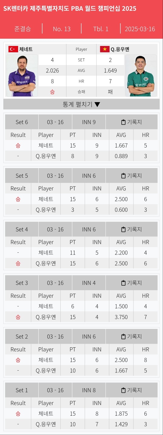 SK렌터카 PBA 월드챔피언십 2025 4강 경기결과, 륏피 체네트(루피 체넷) - 응웅옌꾸옥응우옌 선수의 경기에서는 튀르키예 출신의 체네트가 세트 스코어 4대 2로 이기고 결승에 진출하였습니다.
