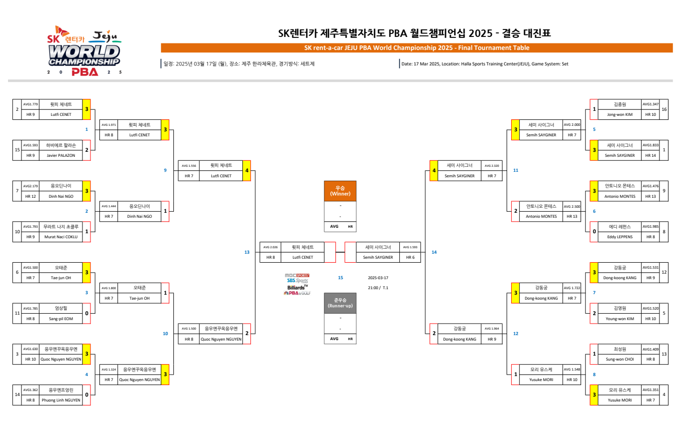 3월 17일 저녁에 펼쳐지는 "SK렌터카 제주특별자치도 PBA 월드챔피언십 2025" 대회 결승 대진표입니다.