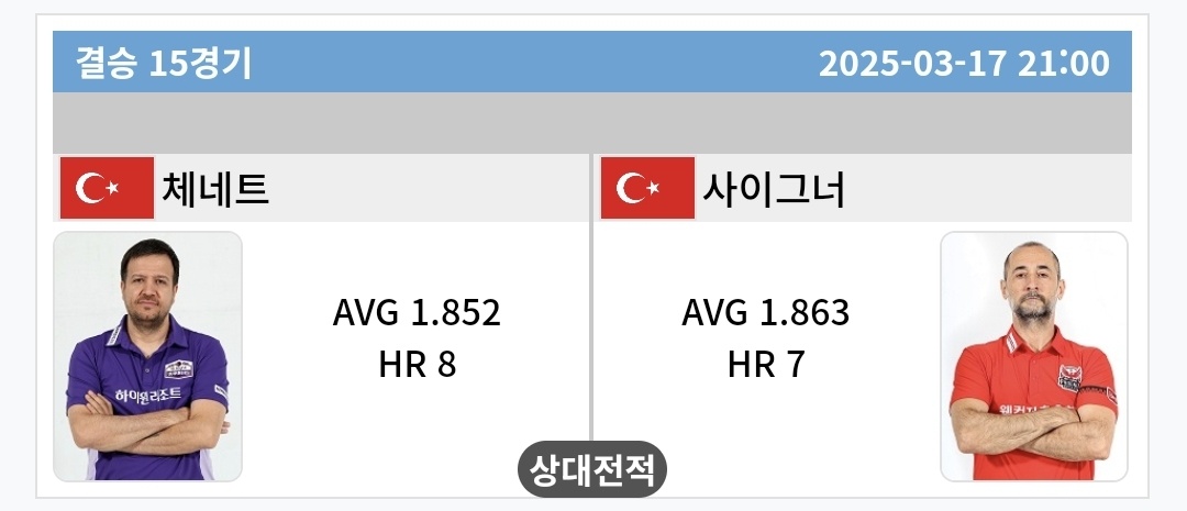 SK렌터카 제주특별자치도 PBA 월드챔피언십 2025 결승전에 오른 선수는 2명 모두 튀르키예 출신으로 지난 프로당구 2023-24시즌에 함께 PBA 프로당구 무대로 진출하였습니다.