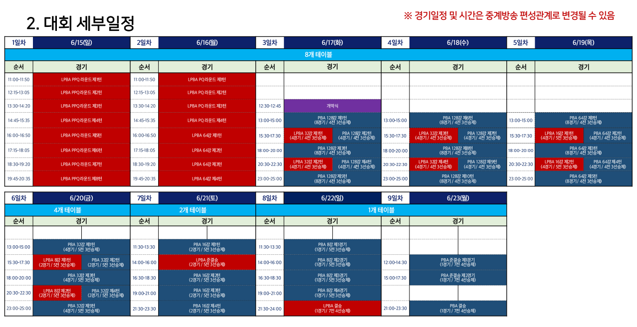 - 대회일정 : LPBA 2025년 6월 15일(일) ~ 22일(일) , PBA 2025년 6월 15일(일) ~ 23일(월)