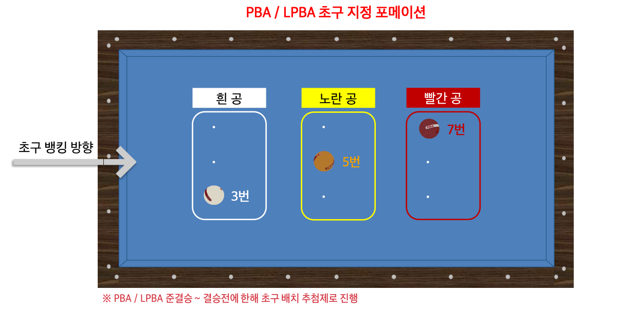 PBA 프로당구의 매력 가운데 하나는 초구 포메이션입니니다. 그동안 정설처럼 지켜져온 UMB(세계당구연맹)의 초쿠 규칙은 우리가 흔히 치는 4구 경기의 초구 포메이션과 동일하여 프로선수라면 누구나 쉽게 득점하는 포지션입니다. 하지만 PBA 프로당구협회가 정한 초구 포메이션은 매 대회마다 미리 지정한 배치를 공지합니다. 또한 준결승과 결승전에는 9개의 카드 추점에 따라 초구 배치 3개 포인트를 정하는 추첨제를 운영하고 있습니다.