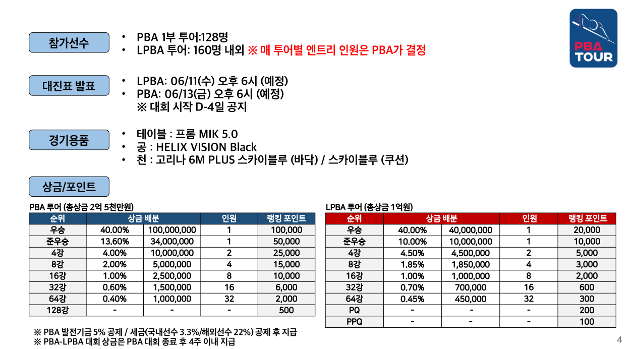 - 총상금: PBA 2억5천만 원 / LPBA 1억 원