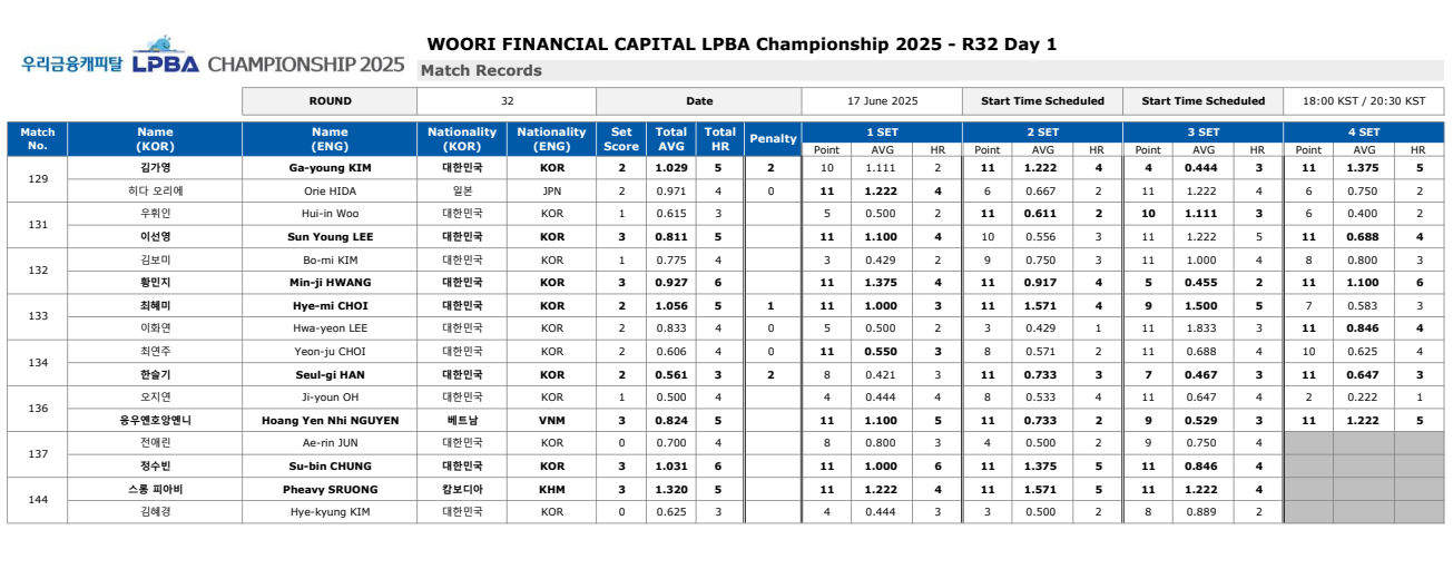 PBA 프로당구협회가 배포한 우리금융캐피탈 LPBA 챔피언십 32강 1일차 경기결과 원본 PDF자료입니다.