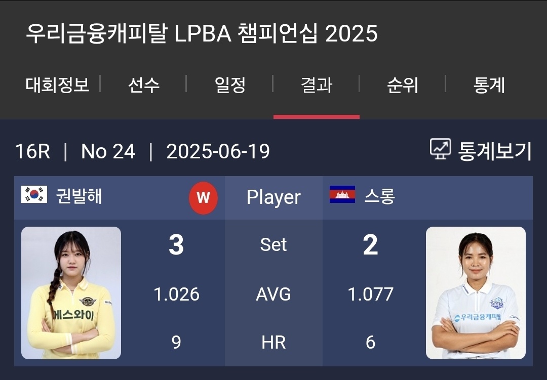 | 우리금융캐피탈 LPBA 챔피언십 16강 대진표 - 32강 경기결과 (3) | 2025.06.18 |