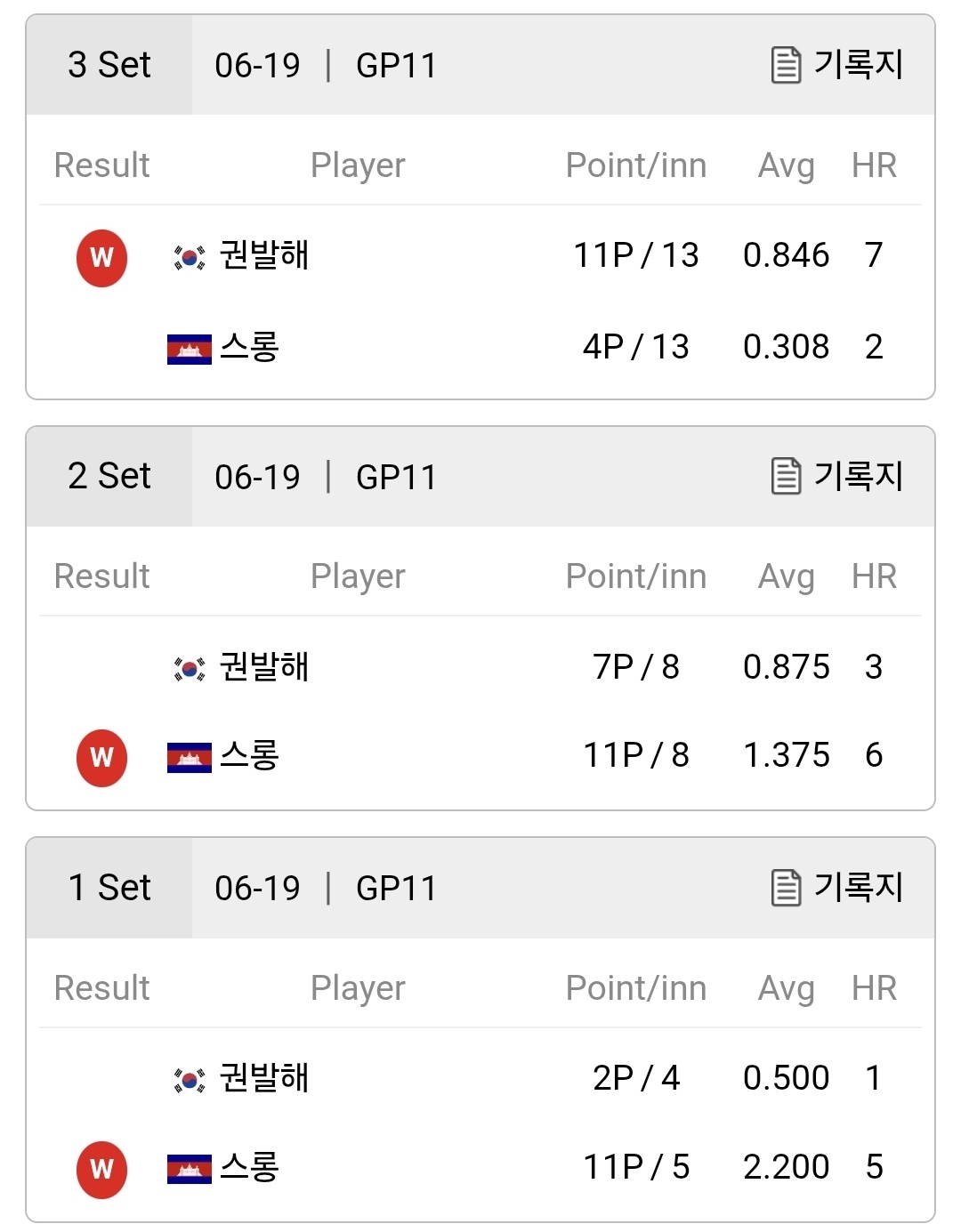하지만 권발해 선수의 눈빛과 큐끝이 3세트부터 날카로와졌습니다. 권발해 선수는 3세트에서 하이런 7개를 치면서 11대 4로 한 세트를 따라잡았습니다.