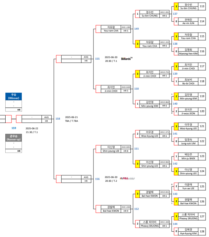 | 우리금융캐피탈 LPBA 챔피언십 8강 대진표 (프로당구 2025-26시즌) (4) | 2025.06.20 |