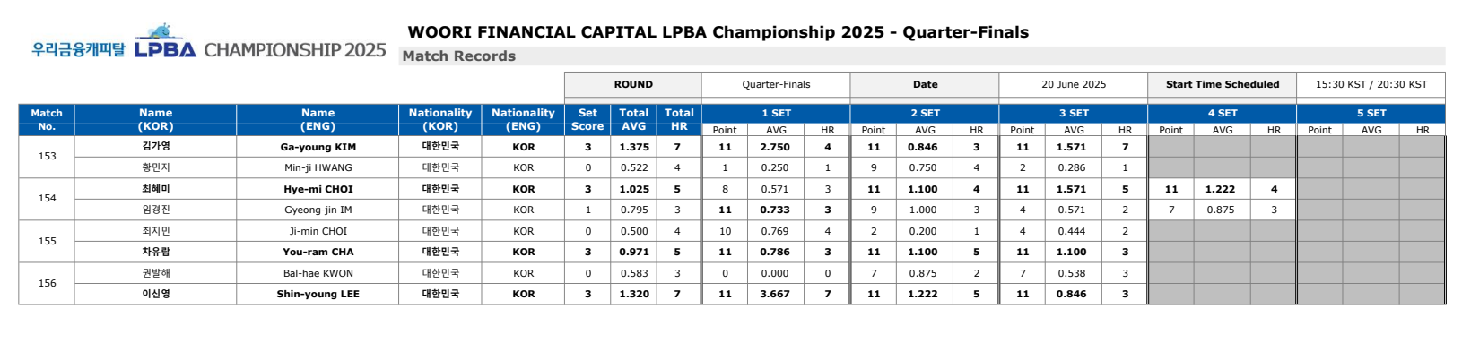 ■ 우리금융캐피탈 LPBA 챔피언십 8강 경기결과