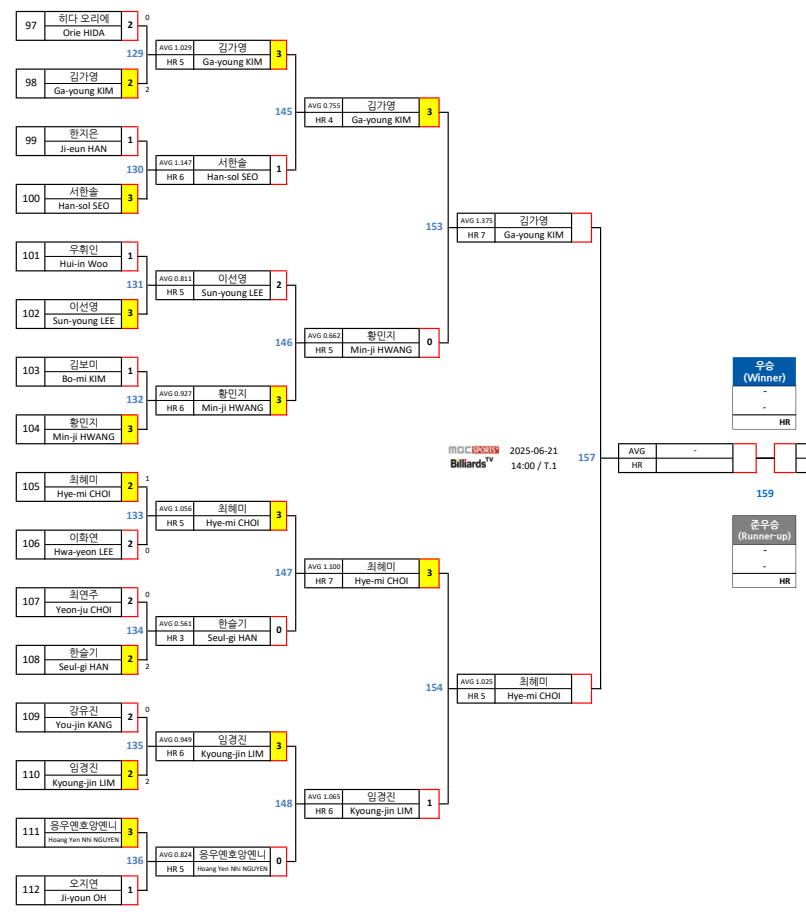 김가영 선수는 32강 부터 히다 오리에, 서한솔, 황민지 선수를 차례로 이기고 4강 준결승에 진출하였습니다. 반면 최혜미 선수는 이화연, 한슬기, 임경진 선수를 이기고 4강 준결승에 진출하였습니다.