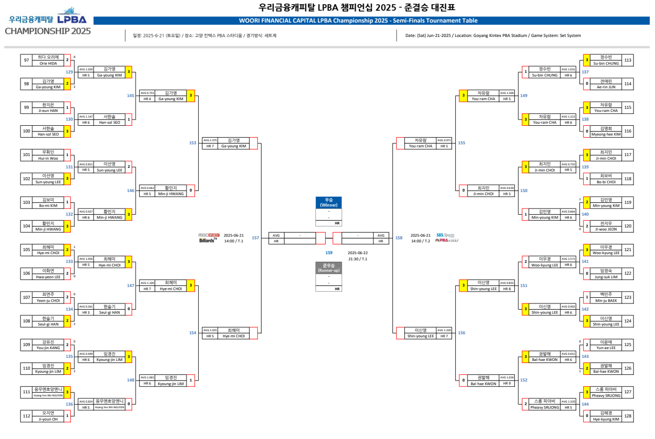 우리금융캐피탈 LPBA 챔피언십 8강 경기결과에 따른 우리금융캐피탈 LPBA 챔피언십 4강 준결승 대진표입니다. 4